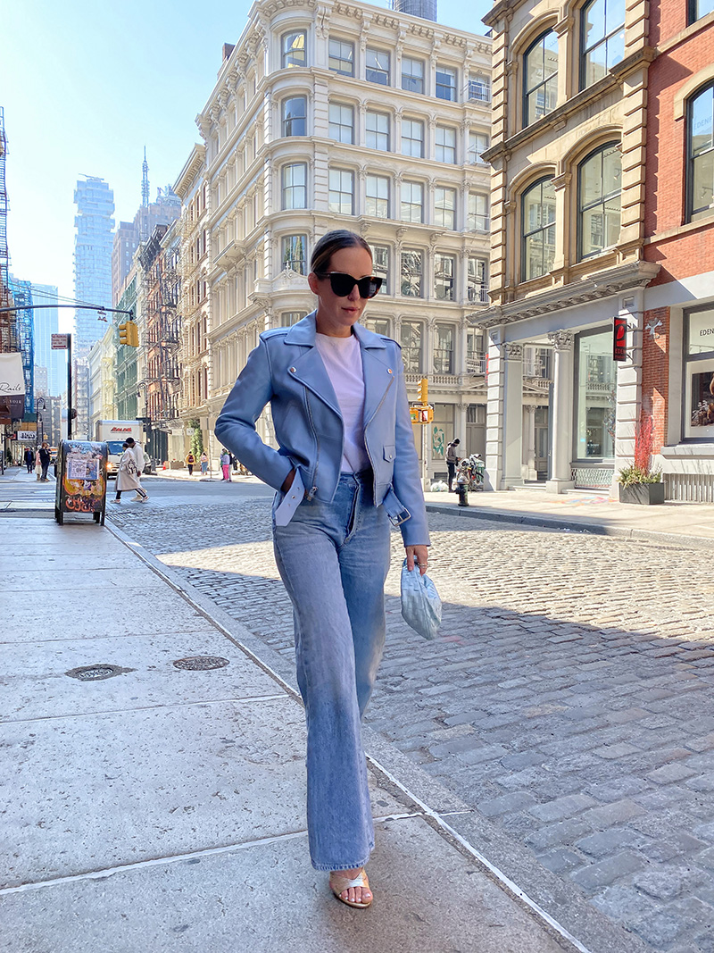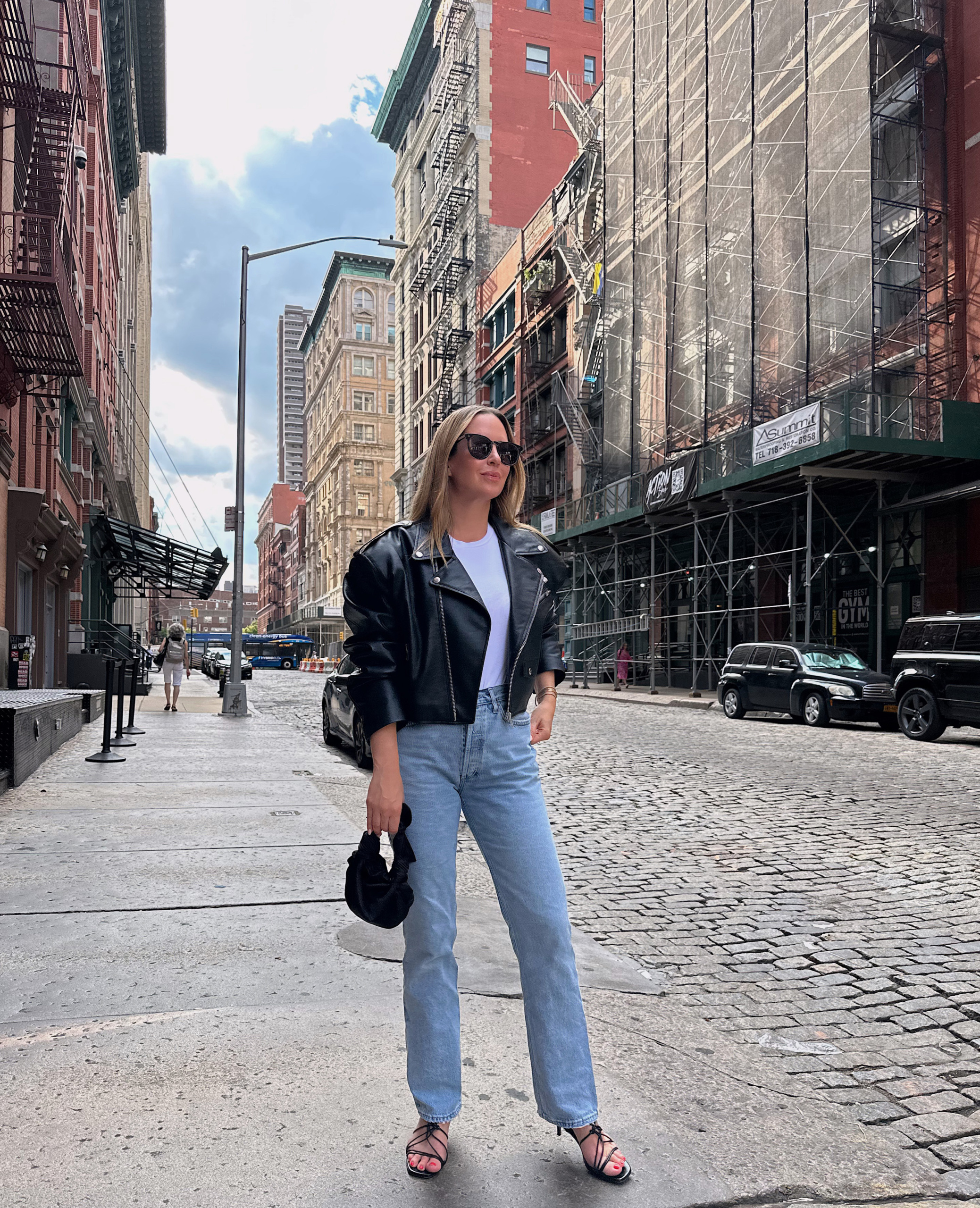 Denim: AGOLDE Lana | Tee (in a M) | Sandals: Emmie Parsons (true to size) | Jacket: Frankie Shop | Bag NLA Collection