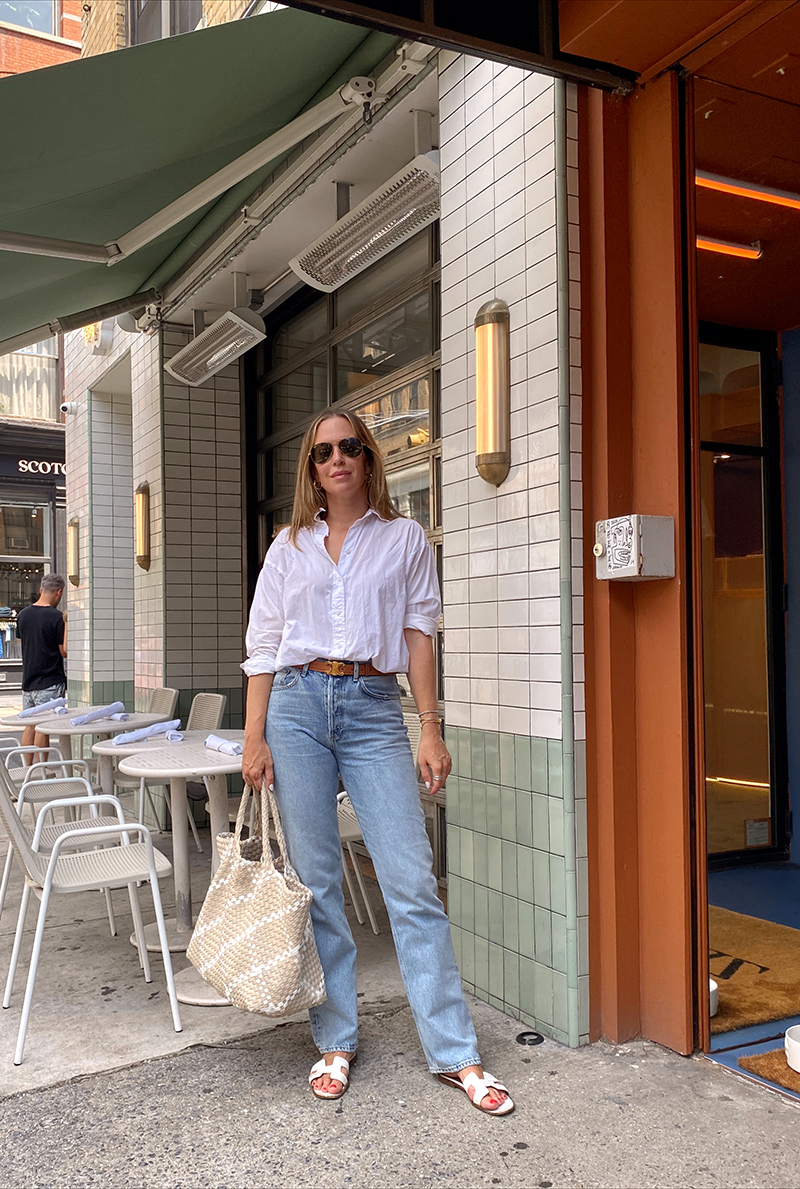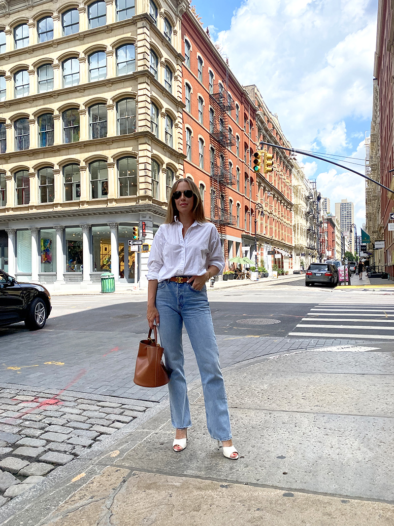 Agolde Lana | Button Down (in a size 2) | Mules | Bag | Sunglasses | Belt
