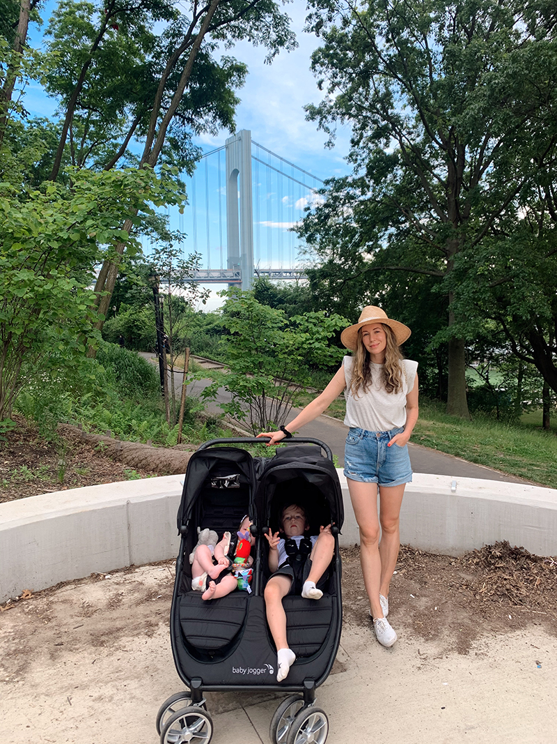Hat: Eugena Kim (old. similar) | Tank: Mango (wearing the XS/S) | Shorts: One Teaspoon (I went with my usual denim size) | Sneakers: Keds | Stroller: Citi Mini Baby Jogger Double