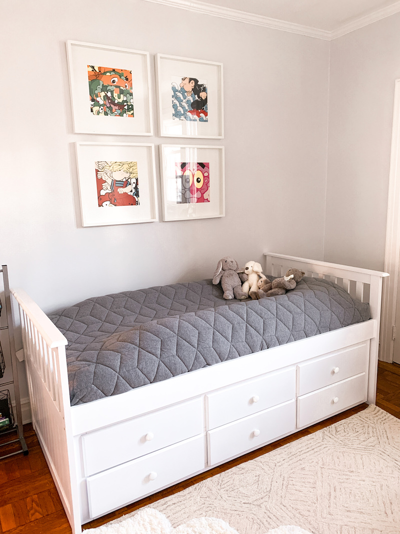 Nate’s first big boy bed! We opted to go straight to a twin bed. It’s something he’ll use for years to come, rather than a toddler bed which is pretty short lived. I picked this one because not only does it have three extra drawers, which is always a plus, but it’s also has a trundle option, something we knew we wanted. To make the transition from a crib to a bed relatively seamless, I added these Milliard bed bumpers and they’ve been great!