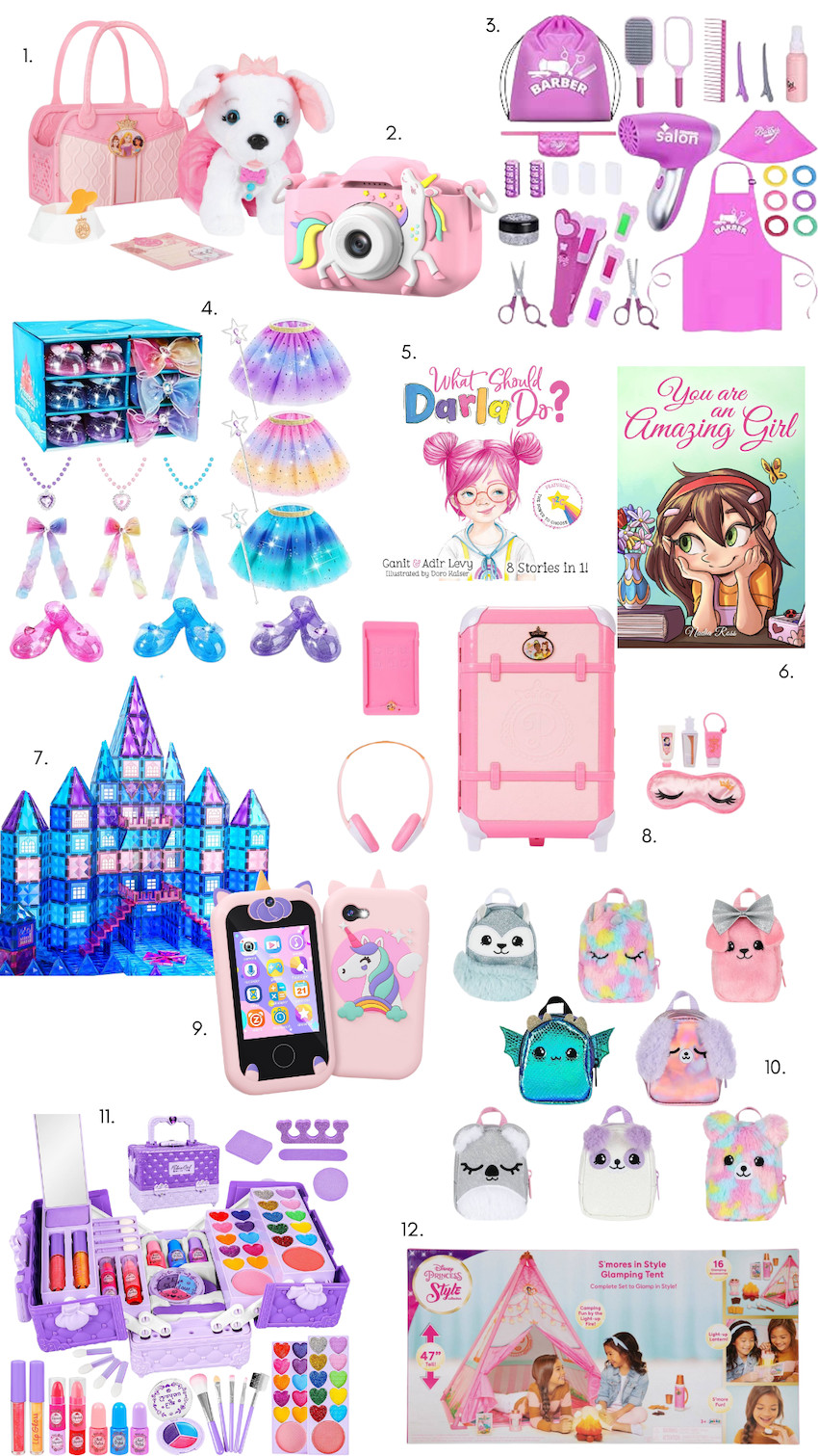 1. Disney Princess Trendy Puppy & Tote |2. Kids Camera | 3. Hair Salon Toy Set | 4. Princess Dress Up Set | 5. ‘What Should Darla Do? Book | 6. ‘You Are An Amazing Girl’ Book | 7. Frozen Princess Castle Magnetic Tiles Building Blocks | 8. Disney Princess Deluxe Suitcase | 9. Kids Smart Phone | 10. Real Littles Pet Packs Collection | 11. Kids Makeup Kit | 12. Disney Princess S’mores In Style Glamping Tent
