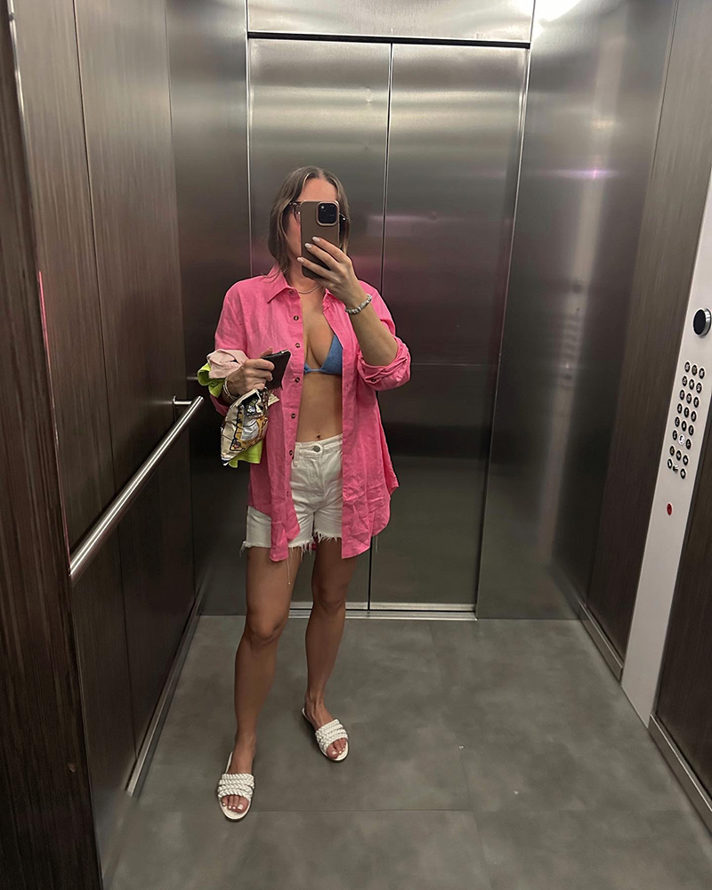 We got back from Cancun, Mexico this past Sunday where we went on a trip with three other families and our children. In my mind, as I planned for this trip, I had every intention of taking beautiful, scenic outfit shots, but the joke was on me. The trip was an absolute blast, but our hands were full with very little downtime. Thankfully, our elevator had a handy little mirror with decent lighting, so that’s where we are.
