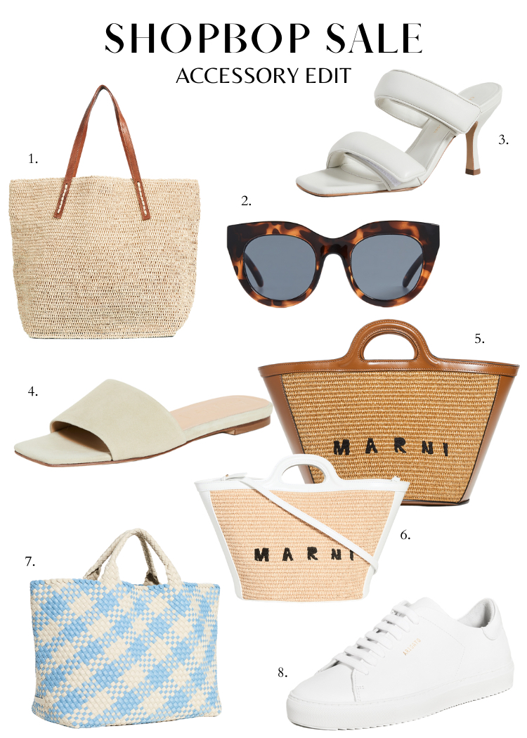1. Mar Y Sol Portland Tote| 2. Le Specs Air Heart Sunglasses | 3. Gia Borghini Perni 03 Sandals| 4. AEYDE Anna Slide Slippers| 5. Marni Tropicalia Summer Bag| 6. Marni Tropicalia Small Bag| 7. Naghedi St Barths Large Tote| 8. Axel Arigato Clean 90 Sneakers