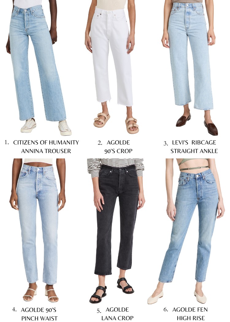 1. Citizens of Humanity Annina Trouser Jean | 2. AGOLDE 90’s Crop – Mid Rise Loose Straight Jean | 3. Levi’s Ribcage Straight Ankle Jean| 4. The AGOLDE 90’s Pinch Waist High Rise Straight Jean| 5. AGOLDE Lana Crop Jean| 6. AGOLDE Fen High Rise Relaxed Tapered Jean: