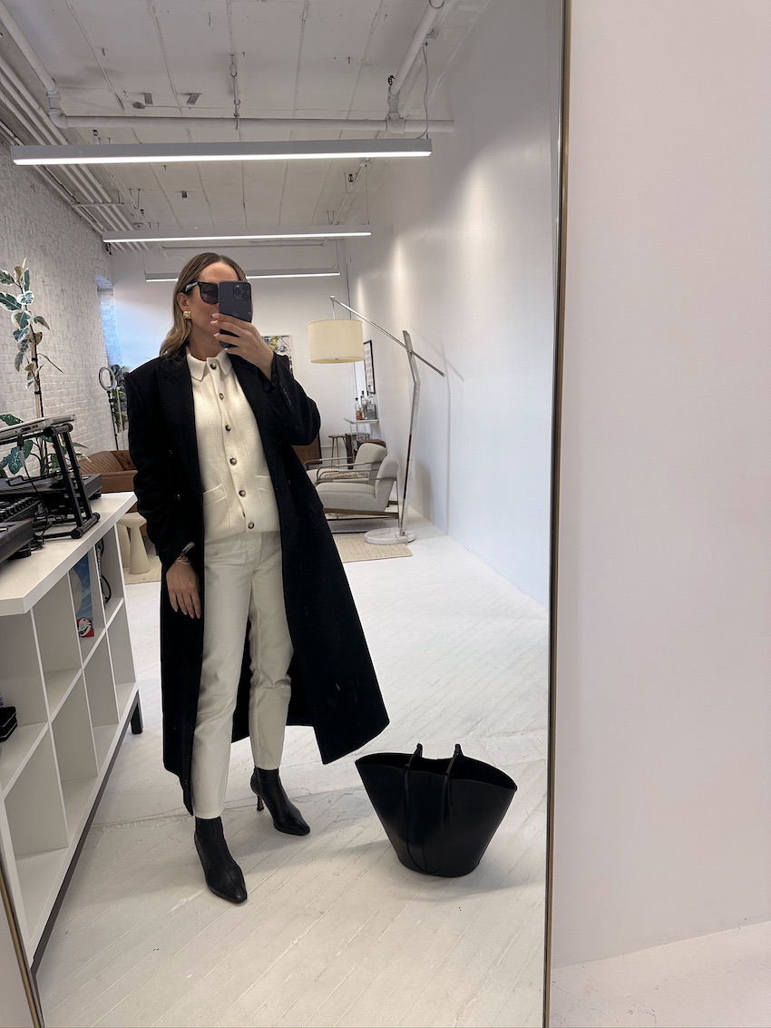 Coat (I sized up. in a size 8)|Denim: Sézane | Boots: Khaite | Phone case