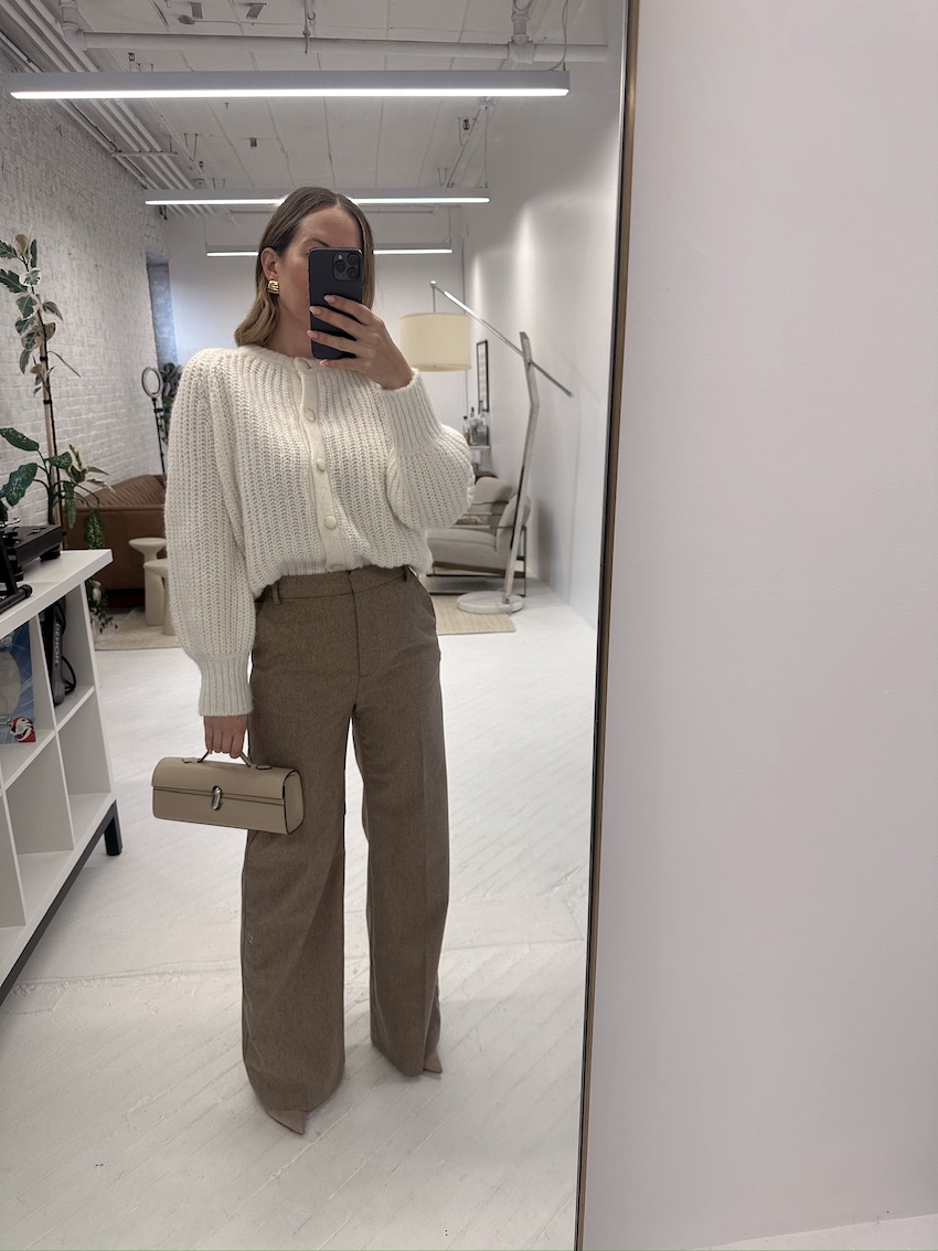 Sézane Emile Cardigan (runs small, wearing a large) | Sézane Matheo Trousers (wearing size 6/38) | Savette Slim Symmetry Bag | Heaven Mayhem earrings.