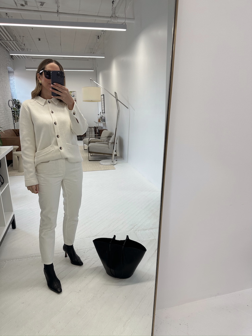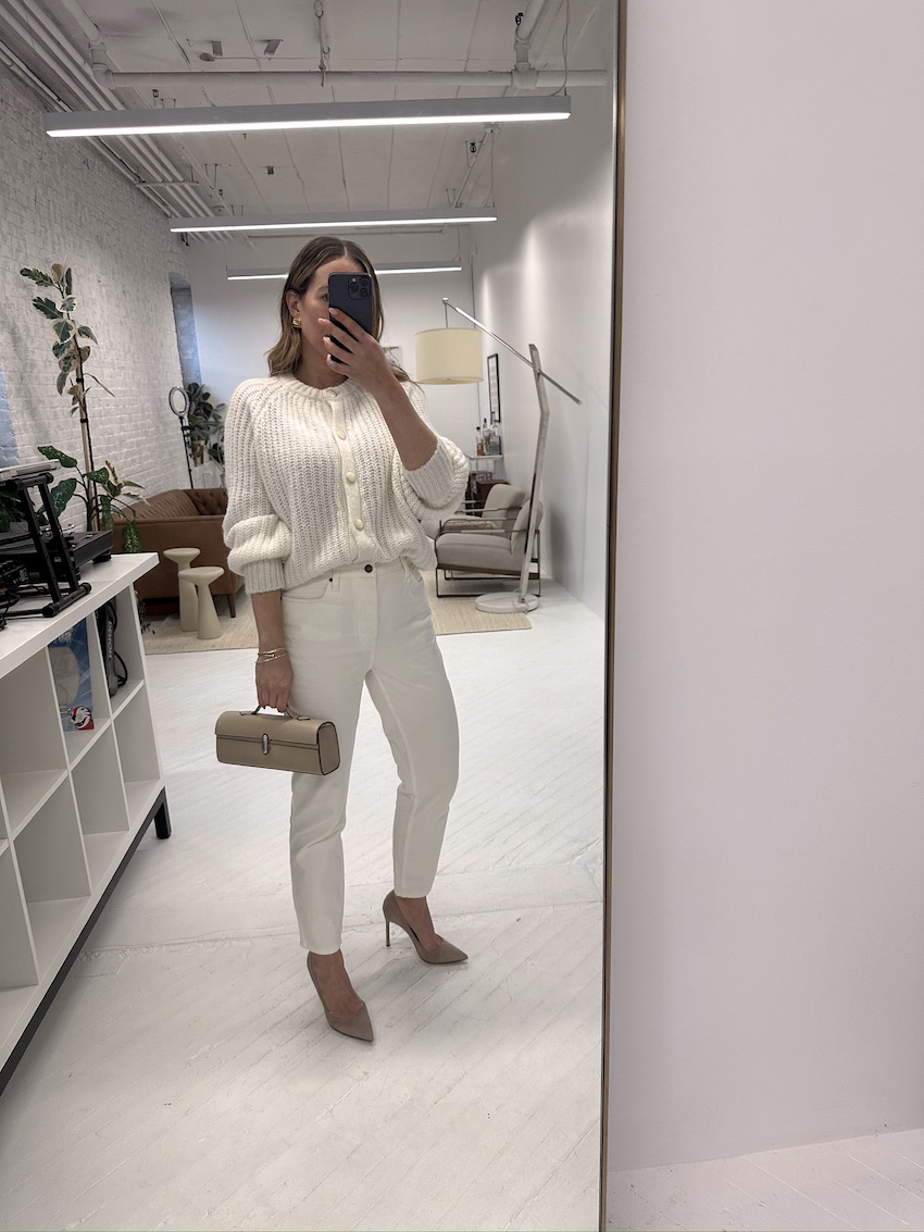 Sézane Emile Cardigan (runs small, wearing a large) | Sézane Brut Sexy Ecru Denim (I size up 2 sizes) | Savette Slim Symmetry Bag | Shoes: Manolo Blahnik